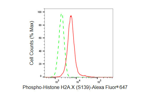 Flow cytometric analysis of Phospho-Histone H2A.X (S139) expression in HepG2 cells using Phospho-Histone H2A.X (S139) antibody. Green, isotype control; red, Phospho-Histone H2A.X (S139).