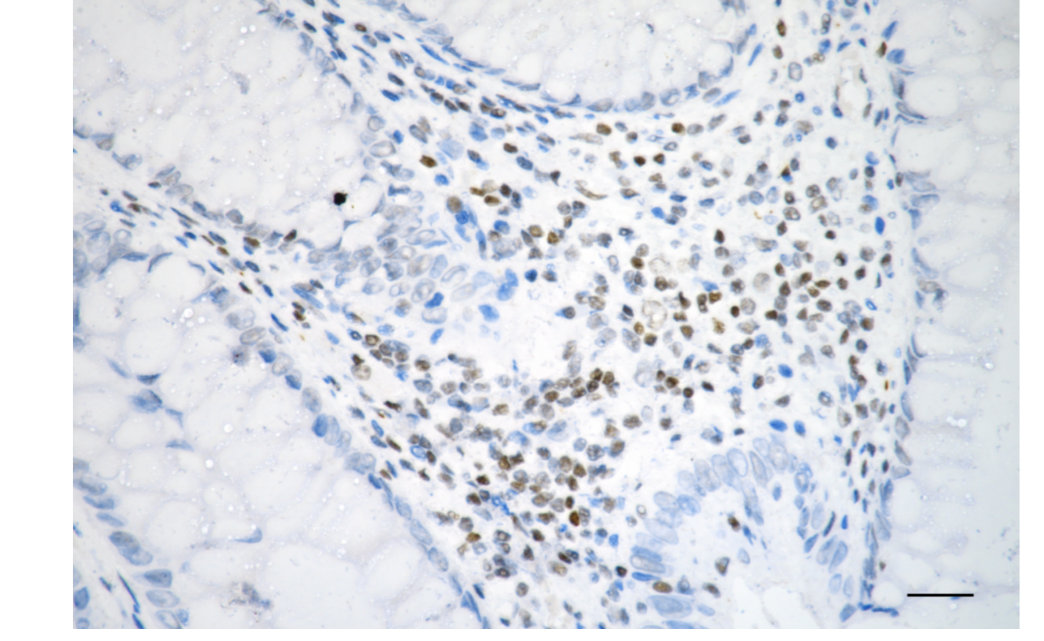 Immunohistochemistry was performed on paraffin-embedded human sigmoid colon carcinoma using histone H3 (acetyl K10) antibody. Antigen retrieval was done in sodium citrate buffer (pH 6.0). DAB was used for detection, with hematoxylin counterstaining. Images were acquired using a Nikon Ci-L Plus microscope (40× objective). Scale bar: 25 μm.