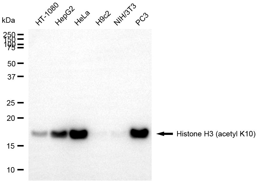 Western blotting analysis using histone H3 (acetyl K10) antibody. Total cell lysates (30 μg) from various cell lines were loaded and separated by SDS-PAGE. The blot was incubated with histone H3 (acetyl K10) antibody and HRP-conjugated goat anti-rabbit secondary antibody respectively.