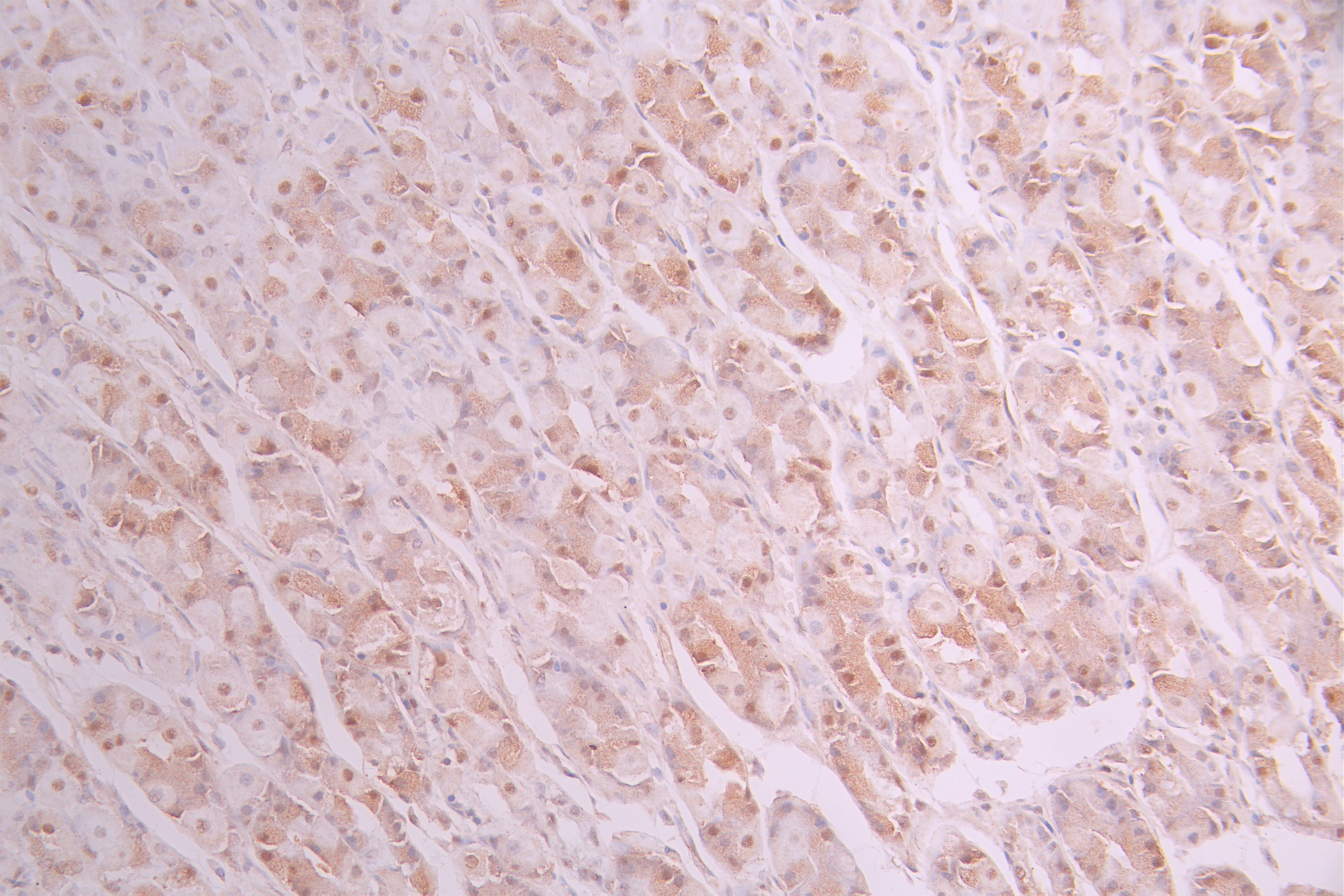 IHC image of CSB-RA172317A0HU diluted at 1:100 and staining in paraffin-embedded human stomach tissue performed on a Leica BondTM system. After dewaxing and hydration, antigen retrieval was mediated by high pressure in a citrate buffer (pH 6.0). Section was blocked with 10% normal goat serum 30min at RT. Then primary antibody (1% BSA) was incubated at 4°C overnight. The primary is detected by a Goat anti-rabbit polymer IgG labeled by HRP and visualized using 0.05% DAB.