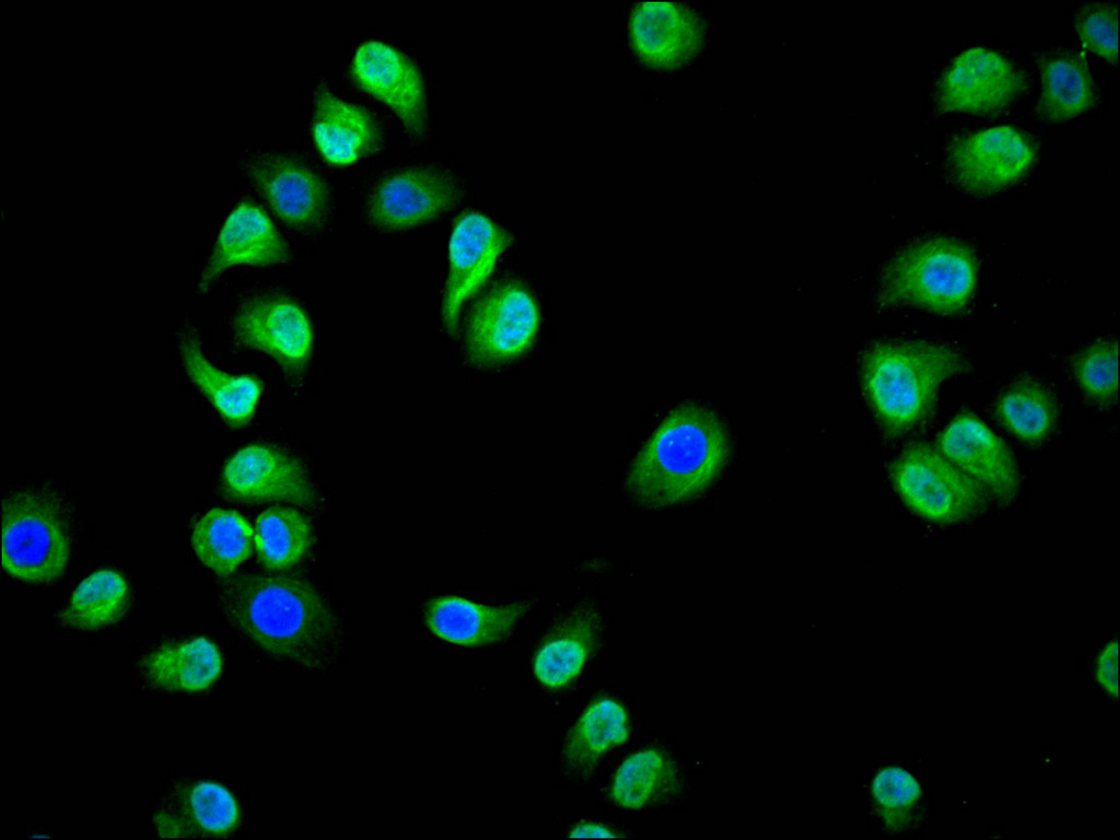 • Immunofluorescence staining of Hela cell with CSB-RA065054A0HU at 1:50, counter-stained with DAPI. The cells were fixed in 4% formaldehyde, permeabilized using 0.2% Triton X-100 and blocked in 10% normal Goat Serum. The cells were then incubated with the antibody overnight at 4°C. The secondary antibody was Alexa Fluor 488-congugated AffiniPure Goat Anti-Rabbit IgG(H+L).