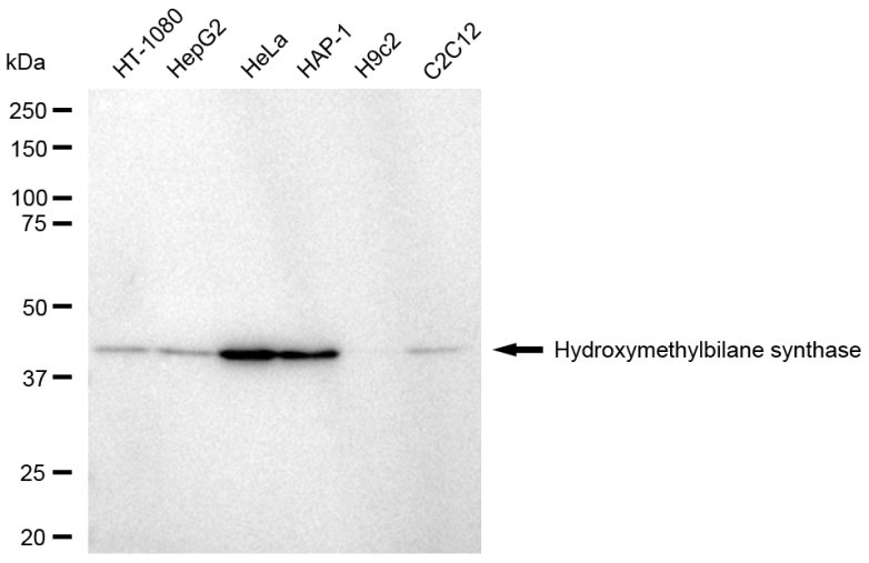 Western blotting analysis using Hydroxymethylbilane synthase antibody. Total cell lysates (30 μg) from various cell lines were loaded and separated by SDS-PAGE. The blot was incubated with Hydroxymethylbilane synthase antibody and HRP-conjugated goat anti-rabbit secondary antibody respectively.