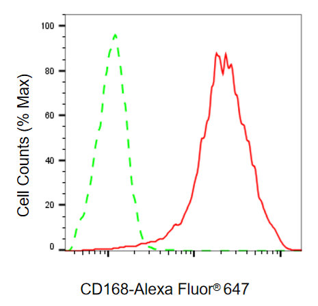 Flow cytometric analysis of CD168 expression in HAP-1 cells using CD168 antibody. Green, isotype control; red, CD168.