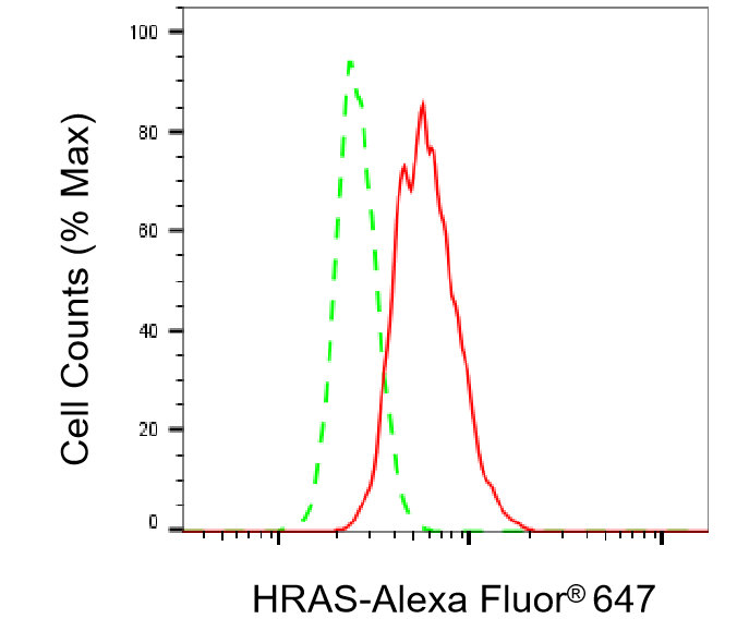 Flow cytometric analysis of HRAS expression in HepG2 cells using HRAS antibody. Green, isotype control; red, HRAS.