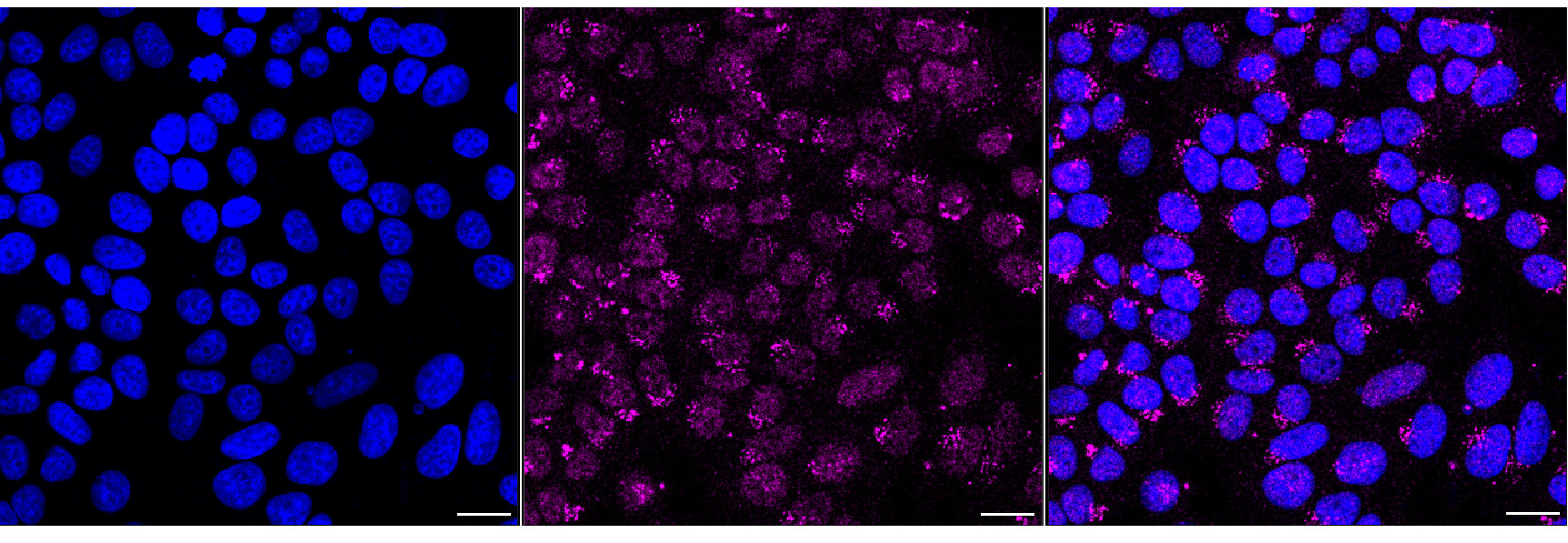 Immunocytochemical staining of HepG2 cells with HRAS antibody. Nuclei were stained blue with DAPI; HRAS was stained magenta with Alexa Fluor? 647. Images were taken using Leica stellaris 5. Protein abundance based on laser Intensity and smart gain: Low. Scale bar, 20 μm.