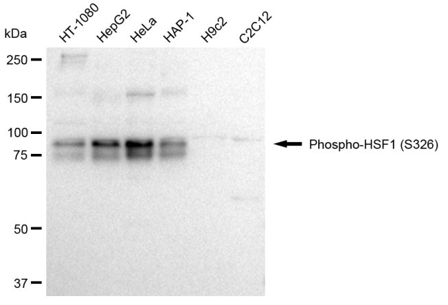 Western blotting analysis using Phospho-HSF1 (S326) antibody. Total cell lysates (30 μg) from various cell lines were loaded and separated by SDS-PAGE. The blot was incubated with Phospho-HSF1 (S326) antibody and HRP-conjugated goat anti-rabbit secondary antibody respectively.
