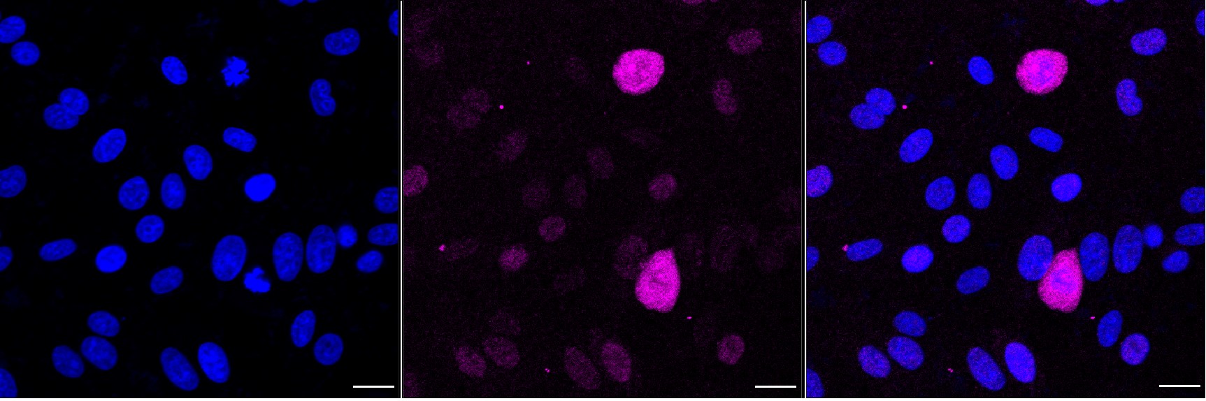 Immunocytochemical staining of HepG2 cells with Phospho-HSF1 (Ser326) antibody. Nuclei were stained blue with DAPI; Phospho-HSF1 (Ser326) was stained magenta with Alexa Fluor? 647. Images were taken using Leica stellaris 5. Protein abundance based on laser Intensity and smart gain: Medium. Scale bar, 20 μm.