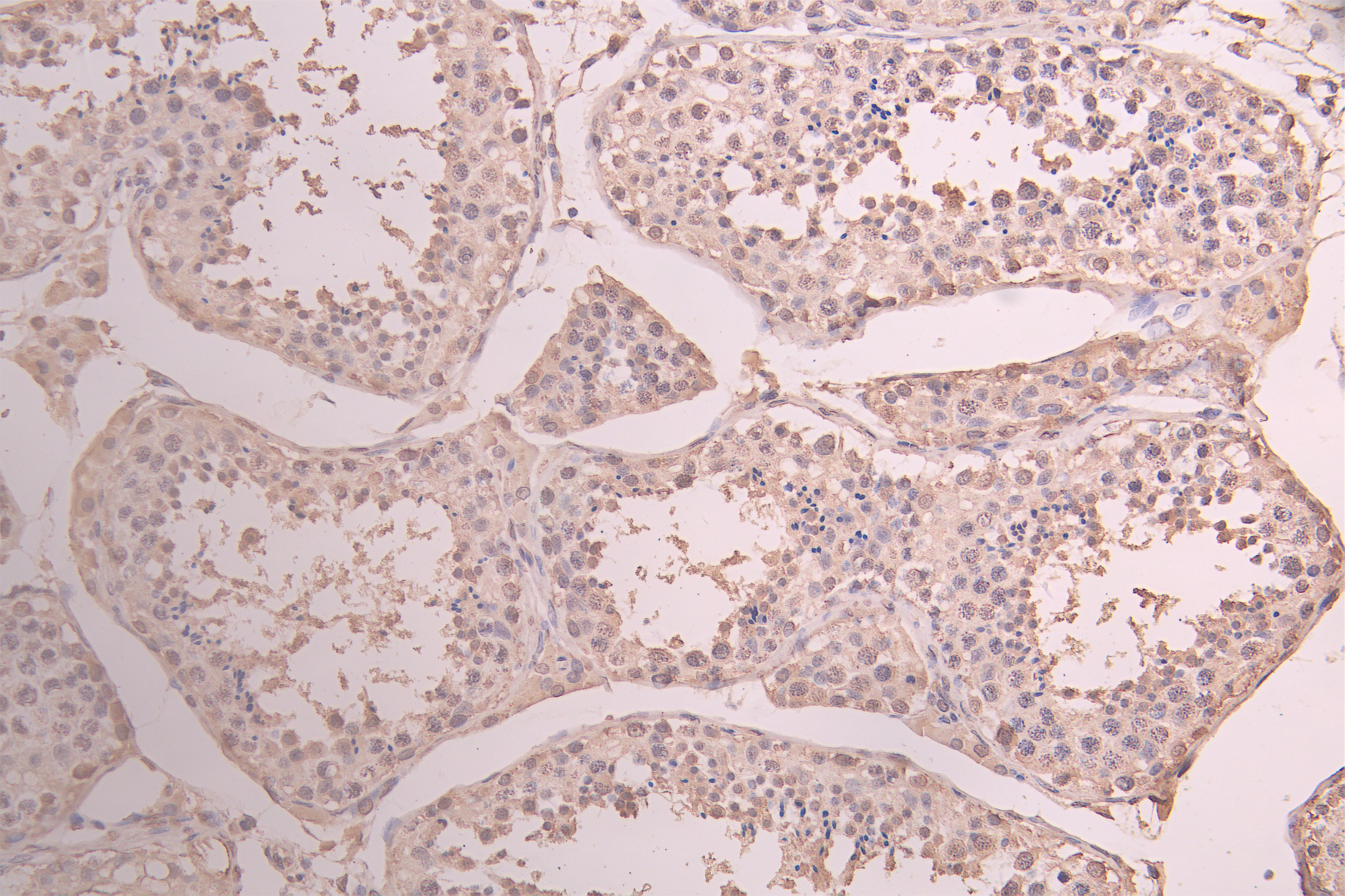 IHC image of CSB-RA010829MA1HU diluted at 1:100 and staining in paraffin-embedded human testis tissue performed on a Leica BondTM system. After dewaxing and hydration, antigen retrieval was mediated by high pressure in a citrate buffer (pH 6.0). Section was blocked with 10% normal goat serum 30min at RT. Then primary antibody (1% BSA) was incubated at 4°C overnight. The primary is detected by a Goat anti-human polymer IgG labeled by HRP and visualized using 0.05% DAB.