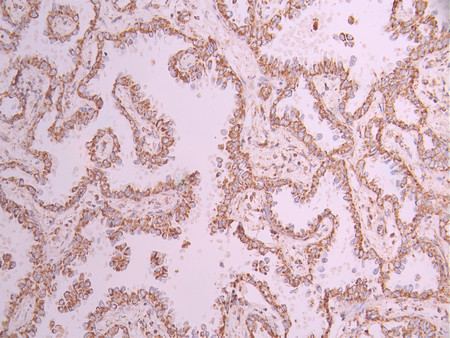 IHC image of CSB-RA957600A0HU diluted at 1:100 and staining in paraffin-embedded human lung cancer performed on a Leica BondTM system. After dewaxing and hydration, antigen retrieval was mediated by high pressure in a citrate buffer (pH 6.0). Section was blocked with 10% normal goat serum 30min at RT. Then primary antibody (1% BSA) was incubated at 4°C overnight. The primary is detected by a Goat anti-rabbit polymer IgG labeled by HRP and visualized using 0.05% DAB.