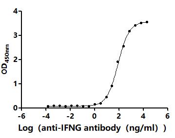 功能:Type II interferon produced by immune cells such as T-cells and NK cells that plays crucial roles in antimicrobial, antiviral, and antitumor responses by activating effector immune cells and enhancing antigen presentation. Primarily signals through the JAK-STAT pathway after interaction with its receptor IFNGR1 to affect gene regulation. Upon IFNG binding, IFNGR1 intracellular domain opens out to allow association of downstream signaling components JAK2, JAK1 and STAT1, leading to STAT1 activation, nuclear translocation and transcription of IFNG-regulated genes. Many of the induced genes are transcription factors such as IRF1 that are able to further drive regulation of a next wave of transcription. Plays a role in class I antigen presentation pathway by inducing a replacement of catalytic proteasome subunits with immunoproteasome subunits. In turn, increases the quantity, quality, and repertoire of peptides for class I MHC loading. Increases the efficiency of peptide generation also by inducing the expression of activator PA28 that associates with the proteasome and alters its proteolytic cleavage preference. Up-regulates as well MHC II complexes on the cell surface by promoting expression of several key molecules such as cathepsins B/CTSB, H/CTSH, and L/CTSL. Participates in the regulation of hematopoietic stem cells during development and under homeostatic conditions by affecting their development, quiescence, and differentiation.