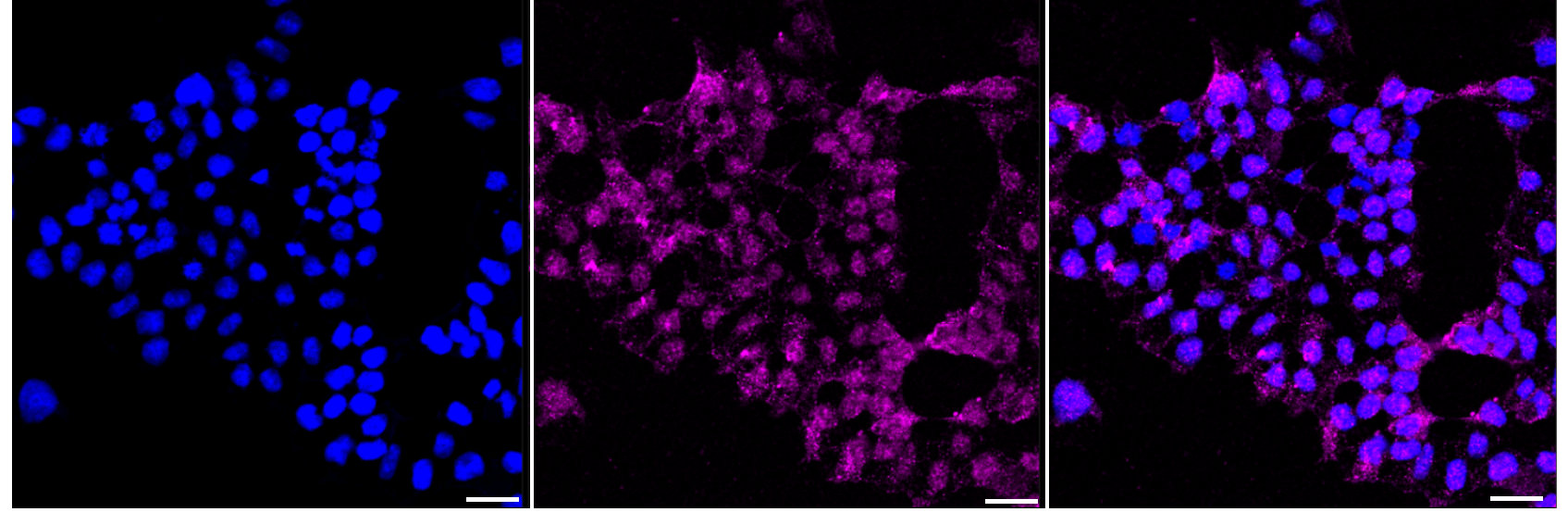 Immunocytochemical staining of HAP1 cells with IGF2BP2 antibody. Nuclei were stained blue with DAPI;IGF2BP2 was stained magenta with Alexa Fluor? 647. Images were taken using Leica stellaris 5. Protein abundance based on laser Intensity and smart gain: Medium. Scale bar: 20 μm.