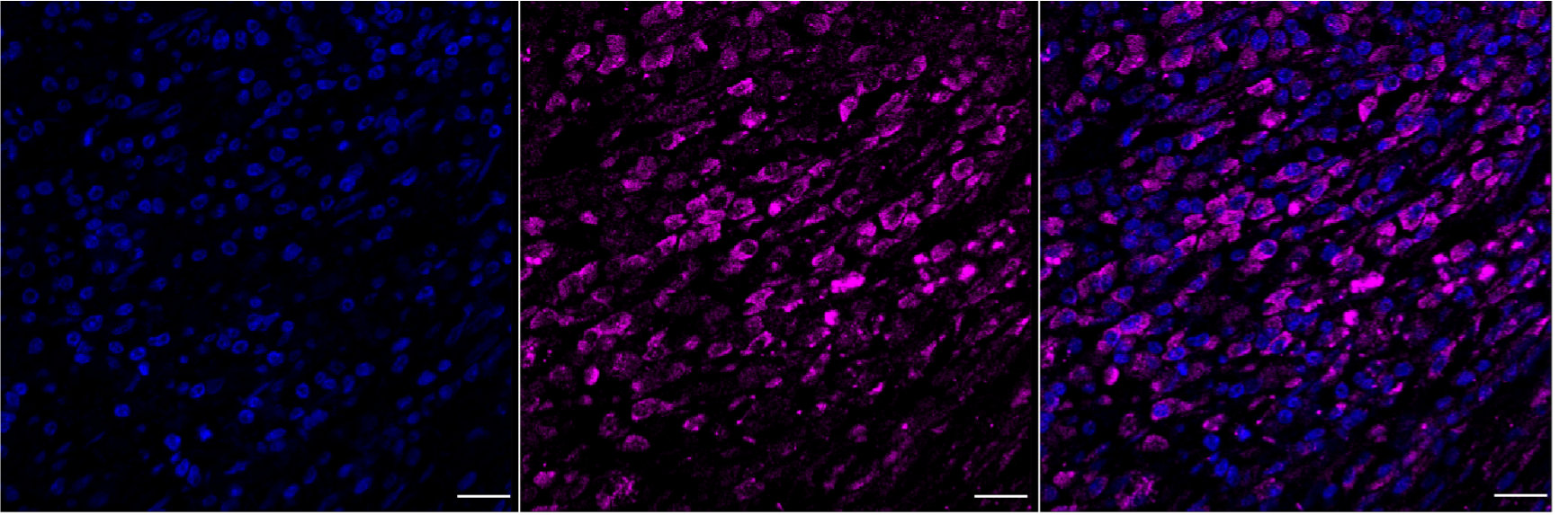 Immunohistochemistry was performed on paraffin-embedded mouse brain sections using IGF2BP2 antibody. Antigen retrieval was carried out in sodium citrate buffer (pH 6.0). Nuclei were counterstained with DAPI (blue), and IGF2BP2 was visualized with Alexa Fluor? 647 (magenta). Protein abundance, based on laser intensity and smart gain settings, was classified as medium. Images were acquired using a Leica Stellaris 5 confocal microscope. Scale bar: 20 μm.