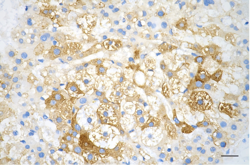Immunohistochemistry was performed on paraffin-embedded mouse liver using IGF2BP2 antibody. Antigen retrieval was done in sodium citrate buffer (pH 6.0). DAB was used for detection, with hematoxylin counterstaining. Images were acquired using a Nikon Ci-L Plus microscope (40× objective). Scale bar: 25 μm.