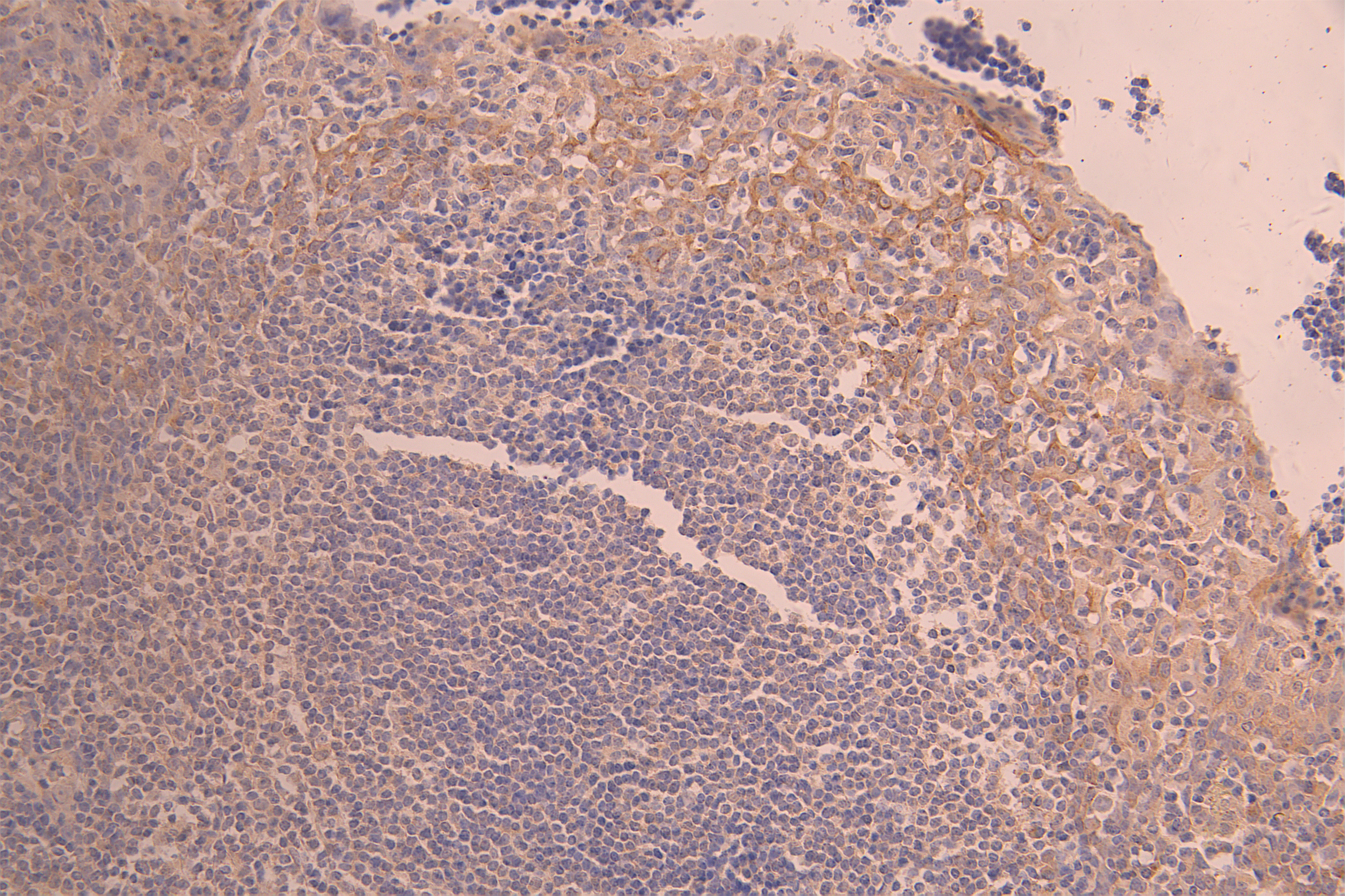 IHC image of CSB-RA011664MA4HU diluted at 1:50 and staining in paraffin-embedded human tonsil tissue performed on a Leica BondTM system. After dewaxing and hydration, antigen retrieval was mediated by high pressure in a citrate buffer (pH 6.0). Section was blocked with 10% normal goat serum 30min at RT. Then primary antibody (1% BSA) was incubated at 4°C overnight. The primary is detected by a Anti-Human lgG, Fcy Fragment Specific labeled by HRP and visualized using 0.05% DAB.