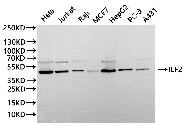 Positive WB detected in: Hela whole cell lysate(30μg), Jurkat whole cell lysate(30μg), Raji whole cell lysate(30μg), MCF-7 whole cell lysate(30μg), HepG2 whole cell lysate(30μg), PC-3 whole cell lysate(30μg), A431 whole cell lysate(30μg)
