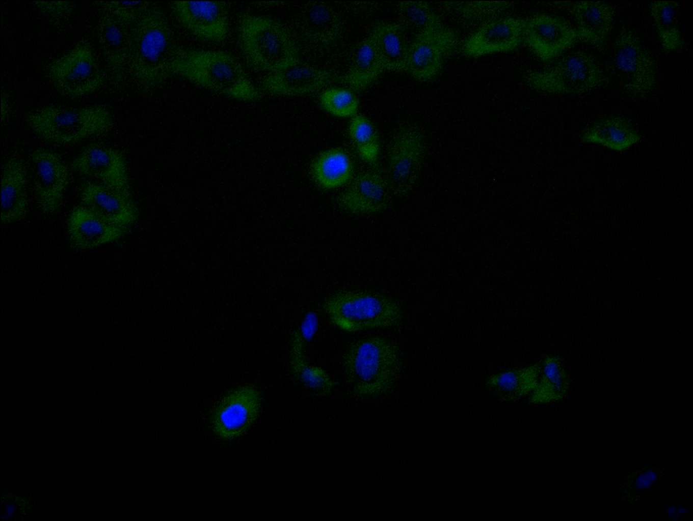 • Immunofluorescence staining of Hela cell with CSB-RA563572A0HU at 1:50, counter-stained with DAPI. The cells were fixed in 4% formaldehyde, permeabilized using 0.2% Triton X-100 and blocked in 10% normal Goat Serum. The cells were then incubated with the antibody overnight at 4°C. The secondary antibody was Alexa Fluor 488-congugated AffiniPure Goat Anti-Rabbit IgG(H+L).