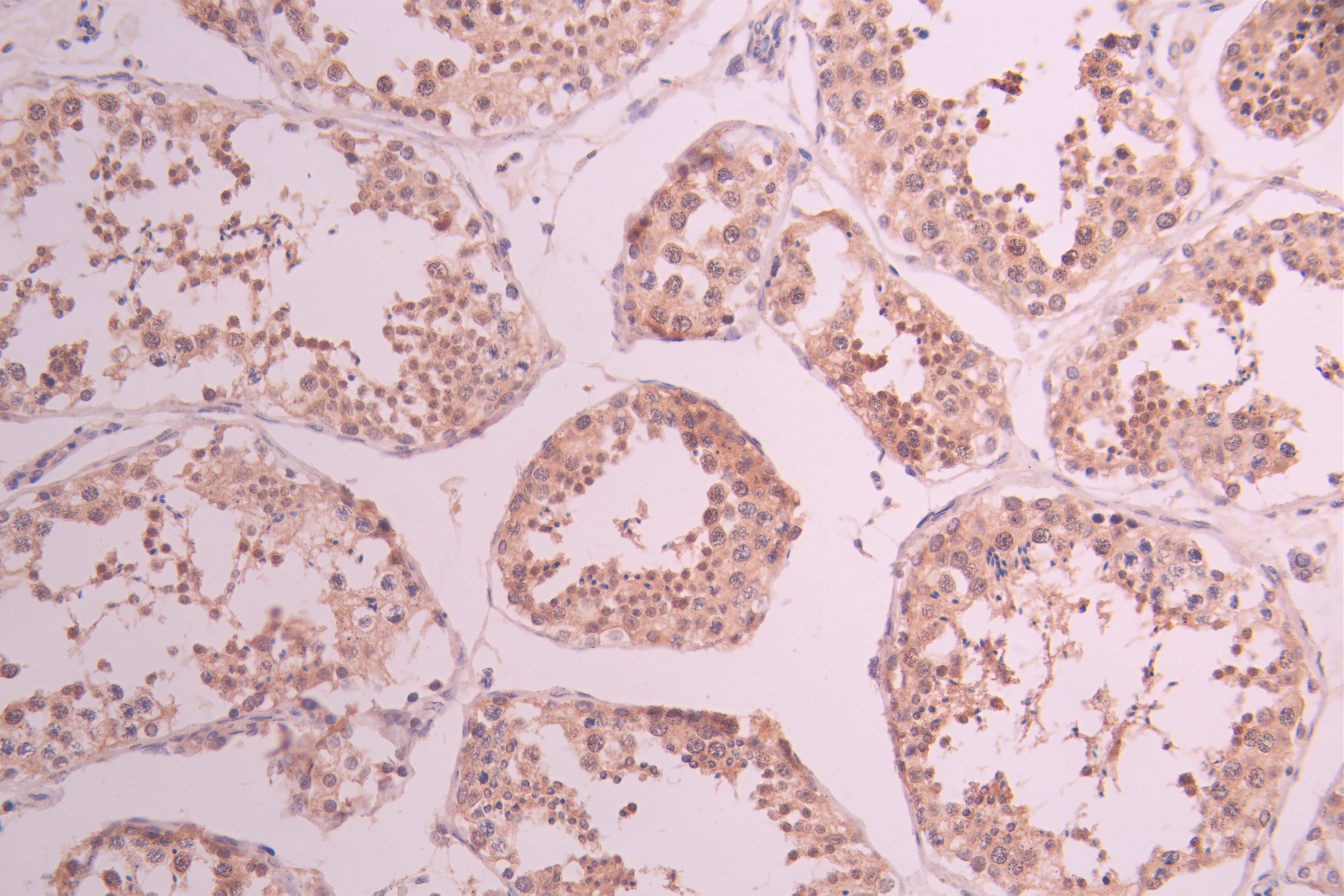 • IHC image of CSB-RA563572A0HU diluted at 1:100 and staining in paraffin-embedded human testis tissue performed on a Leica BondTM system. After dewaxing and hydration, antigen retrieval was mediated by high pressure in a citrate buffer (pH 6.0). Section was blocked with 10% normal goat serum 30min at RT. Then primary antibody (1% BSA) was incubated at 4°C overnight. The primary is detected by a Goat anti-rabbit polymer IgG labeled by HRP and visualized using 0.05% DAB.