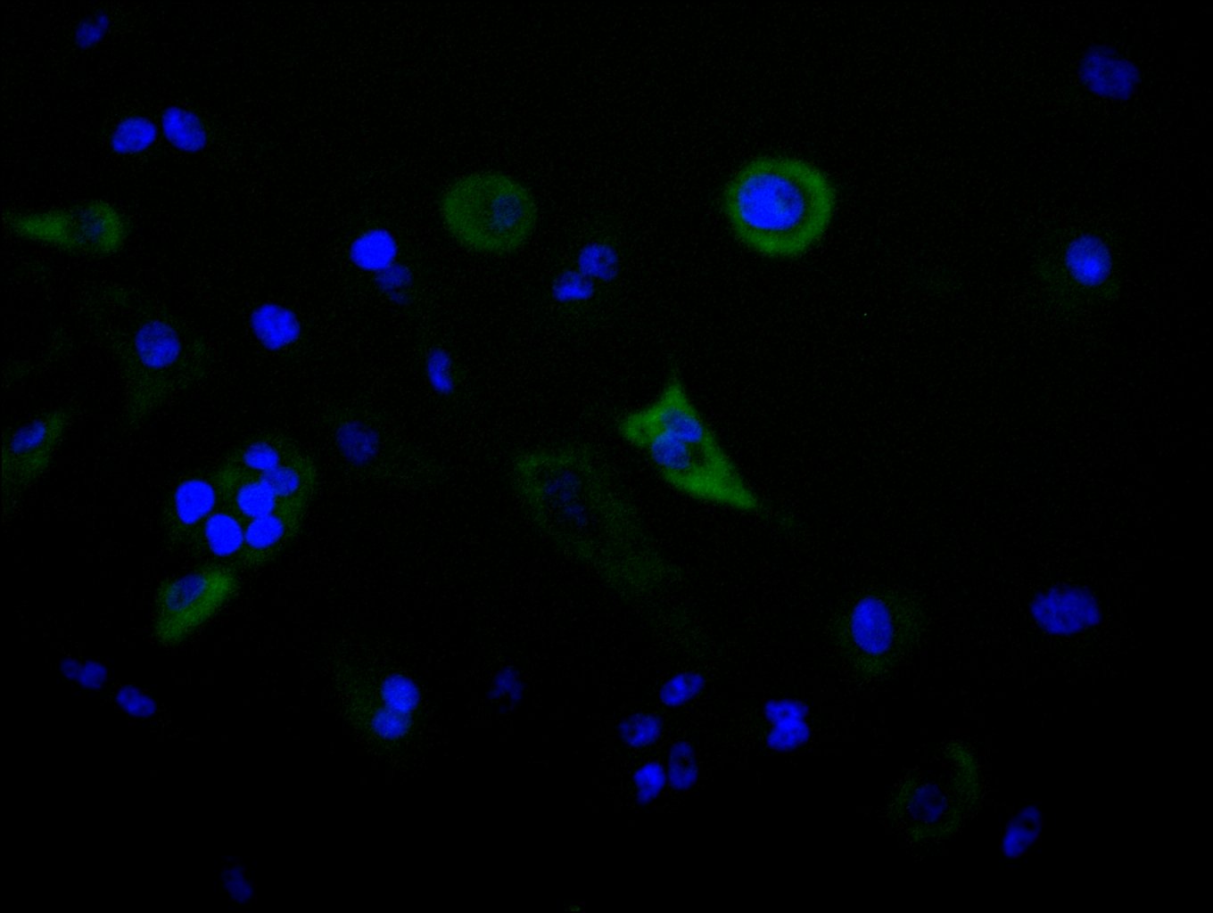 Immunofluorescence staining of HepG2 cell with CSB-RA895988A0HU at 1:50, counter-stained with DAPI. The cells were fixed in 4% formaldehyde, permeabilized using 0.2% Triton X-100 and blocked in 10% normal Goat Serum. The cells were then incubated with the antibody overnight at 4°C. The secondary antibody was Alexa Fluor 488-congugated AffiniPure Goat Anti-Rabbit IgG(H+L).