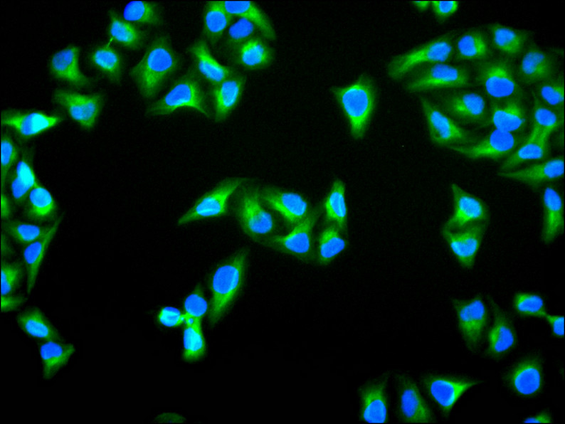 • Immunofluorescence staining of Hela cell with CSB-RA264265A0HU at 1:50 , counter-stained with DAPI. The cells were fixed in 4% formaldehyde, permeabilized using 0.2% Triton X-100 and blocked in 10% normal Goat Serum. The cells were then incubated with the antibody overnight at 4°C. The secondary antibody was Alexa Fluor 488-congugated AffiniPure Goat Anti-Rabbit IgG(H+L).