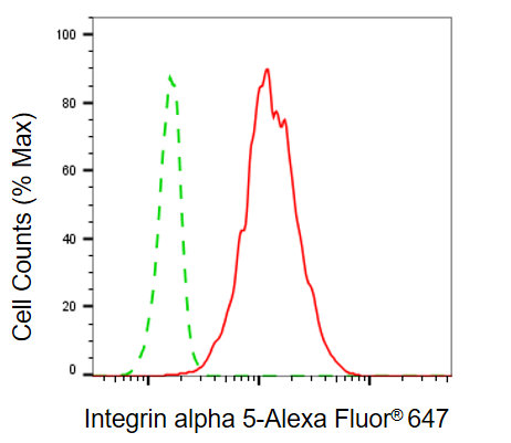 Flow cytometric analysis of integrin alpha 5 expression in C2C12 cells using integrin alpha 5 antibody. Green, isotype control; red, integrin alpha 5.