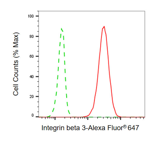• Flow cytometric analysis of Integrin beta 3 expression in C2C12 cells using Integrin beta 3 antibody. Green, isotype control; red, Integrin beta 3.