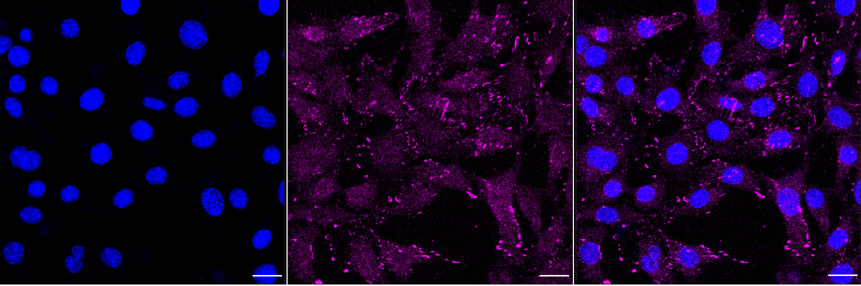 • Immunocytochemical staining of C2C12 cells with Integrin beta 3 antibody. Nuclei were stained blue with DAPI; Integrin beta 3 was stained magenta with Alexa Fluor? 647. Images were taken using Leica stellaris 5. Protein abundance based on laser Intensity and smart gain: Medium. Scale bar, 20 μm.