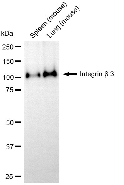 • Western blotting analysis using integrin beta 3 antibody. Total cell lysates (50 μg) from various cell lines were loaded and separated by SDS-PAGE. The blot was incubated with integrin beta 3 antibody and HRP-conjugated goat anti-rabbit secondary antibody respectively.