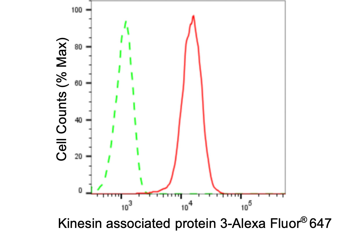Flow cytometric analysis of Kinesin associated protein 3 expression in HepG2 cells using Kinesin associated protein 3 antibody. Green, isotype control; red, Kinesin associated protein 3.
