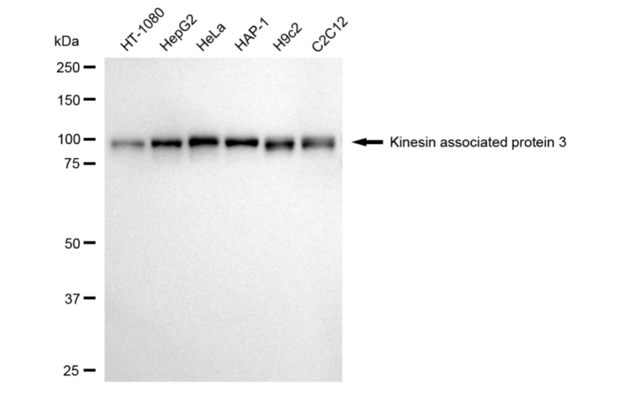 Western blotting analysis using Kinesin associated protein 3 antibody. Total cell lysates (30 μg) from various cell lines were loaded and separated by SDS-PAGE. The blot was incubated with Kinesin associated protein 3 antibody and HRP-conjugated goat anti-rabbit secondary antibody respectively.