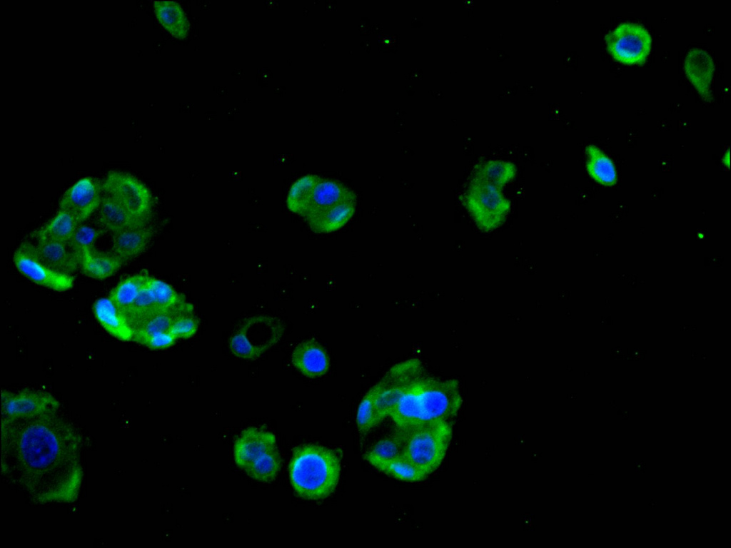 Immunofluorescence staining of HepG2 cell with CSB-RA250248A0HU at 1:50, counter-stained with DAPI. The cells were fixed in 4% formaldehyde, permeabilized using 0.2% Triton X-100 and blocked in 10% normal Goat Serum. The cells were then incubated with the antibody overnight at 4°C. The secondary antibody was Alexa Fluor 488-congugated AffiniPure Goat Anti-Rabbit IgG(H+L).