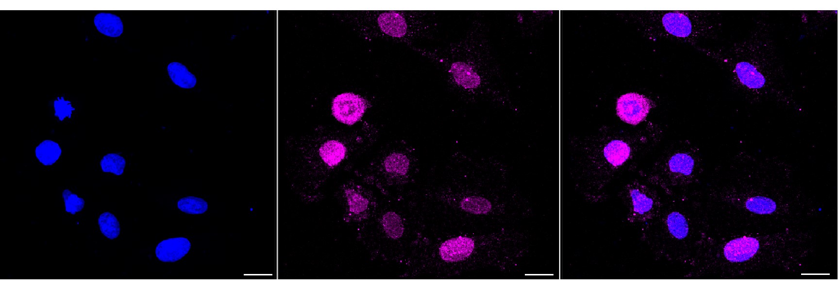 Immunocytochemical staining of H9c2 cells with Keratin 4 antibody. Nuclei were stained blue with DAPI; Keratin 4 was stained magenta with Alexa Fluor? 647. Images were taken using Leica stellaris 5. Protein abundance based on laser Intensity and smart gain: Medium. Scale bar, 20 μm.