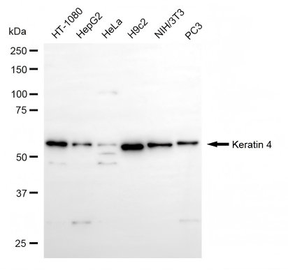 Western blotting analysis using keratin 4 antibody. Total cell lysates (30 μg) from various cell lines were loaded and separated by SDS-PAGE. The blot was incubated with keratin 4 antibody and HRP-conjugated goat anti-rabbit secondary antibody respectively.
