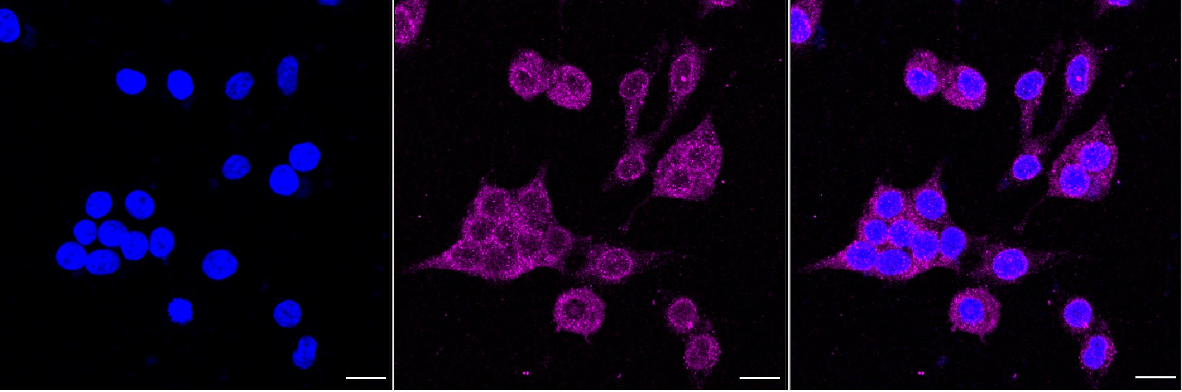 Immunocytochemical staining of HeLa cells with KSR1 antibody . Nuclei were stained blue with DAPI; KSR1 was stained magenta with Alexa Fluor? 647. Images were taken using Leica stellaris 5. Protein abundance based on laser Intensity and smart gain: Medium. Scale bar, 20 μm.