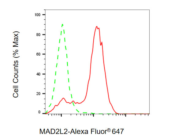 • Flow cytometric analysis of MAD2L2 expression in HAP-1 cells using MAD2L2 antibody. Green, isotype control; red, MAD2L2.