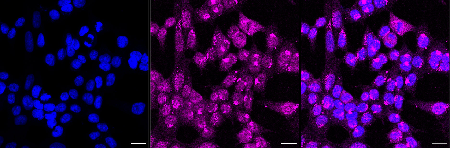 • Immunocytochemical staining of HAP1 cells with MAD2L2 antibody. Nuclei were stained blue with DAPI;MAD2L2 was stained magenta with Alexa Fluor? 647. Images were taken using Leica stellaris 5. Protein abundance based on laser Intensity and smart gain: Medium. Scale bar, 20 μm.
