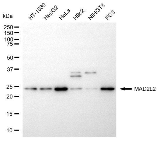 • Western blotting analysis using MAD2L2 antibody. Total cell lysates (30 μg) from various cell lines were loaded and separated by SDS-PAGE. The blot was incubated with MAD2L2 antibody and HRP-conjugated goat anti-rabbit secondary antibody respectively.