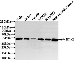 Positive WB detected in: Hela whole cell lysate(30μg), Jurkat whole cell lysate(30μg), HepG2 whole cell lysate(30μg), SW620 whole cell lysate(30μg), NIH/3T3 whole cell lysate(30μg), Mouse brain tissue lysate(30μg)