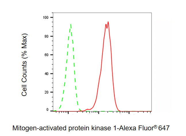 Flow cytometric analysis of Mitogen-activated protein kinase 1 expression in C2C12 cells using Mitogen-activated protein kinase 1 antibody. Green, isotype control; red, Mitogen-activated protein kinase 1.