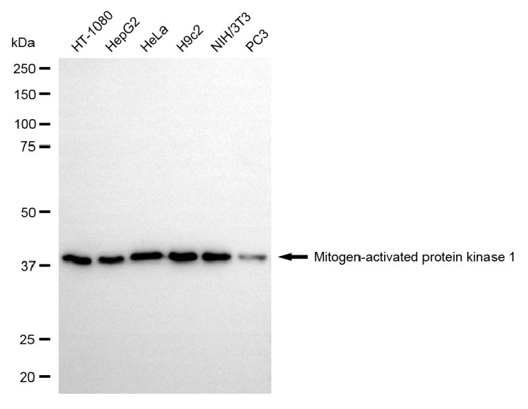 Western blotting analysis using mitogen-activated protein kinase 1 antibody. Total cell lysates (30 μg) from various cell lines were loaded and separated by SDS-PAGE. The blot was incubated with mitogen-activated protein kinase 1 antibody and HRP-conjugated goat anti-rabbit secondary antibody respectively.