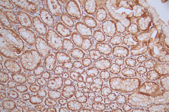 • IHC image of CSB-RA984568A0HU diluted at 1:50 and staining in paraffin-embedded human stomach tissue performed on a Leica BondTM system. After dewaxing and hydration, antigen retrieval was mediated by high pressure in a citrate buffer (pH 6.0). Section was blocked with 10% normal goat serum 30min at RT. Then primary antibody (1% BSA) was incubated at 4°C overnight. The primary is detected by a Goat anti-rabbit polymer IgG labeled by HRP and visualized using 0.64% DAB.