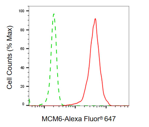 Flow cytometric analysis of MCM6 expression in C2C12 cells using MCM6 antibody. Green, isotype control; red, MCM6.