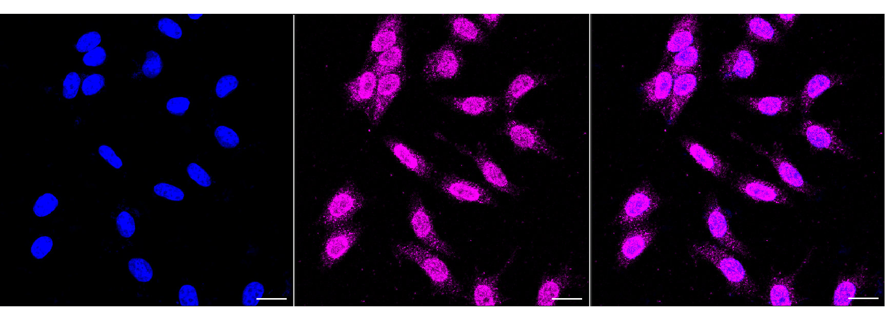 Immunocytochemical staining of HepG2 cells with methylmalonyl-CoA mutase antibody. Nuclei were stained blue with DAPI; Methylmalonyl-CoA mutase was stained magenta with Alexa Fluor? 647. Images were taken using Leica stellaris 5. Protein abundance based on laser Intensity and smart gain: Low. Scale bar, 20 μm.