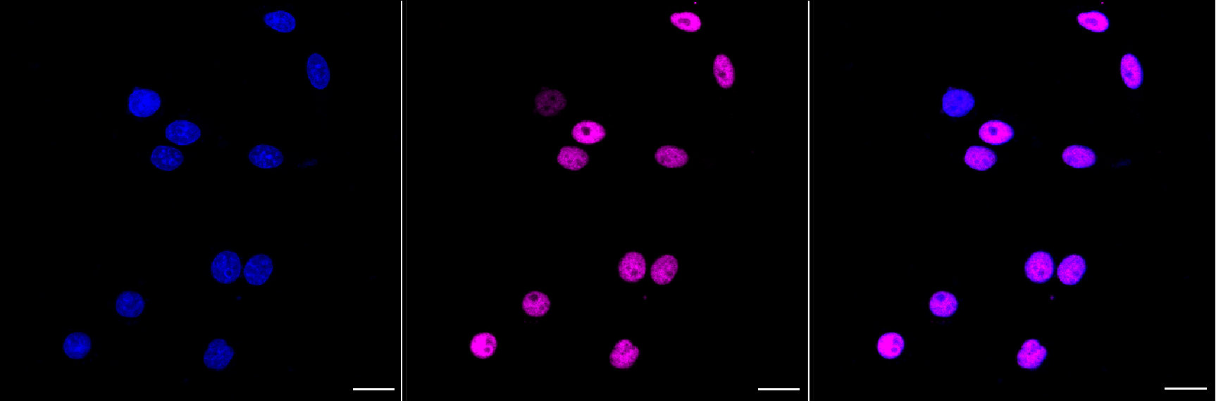 Immunocytochemical staining of HepG2 cells with MTA2 antibody. Nuclei were stained blue with DAPI; MTA2 was stained magenta with Alexa Fluor? 647. Images were taken using Leica stellaris 5. Protein abundance based on laser Intensity and Smart Gain: High. Scale bar, 20 μm.