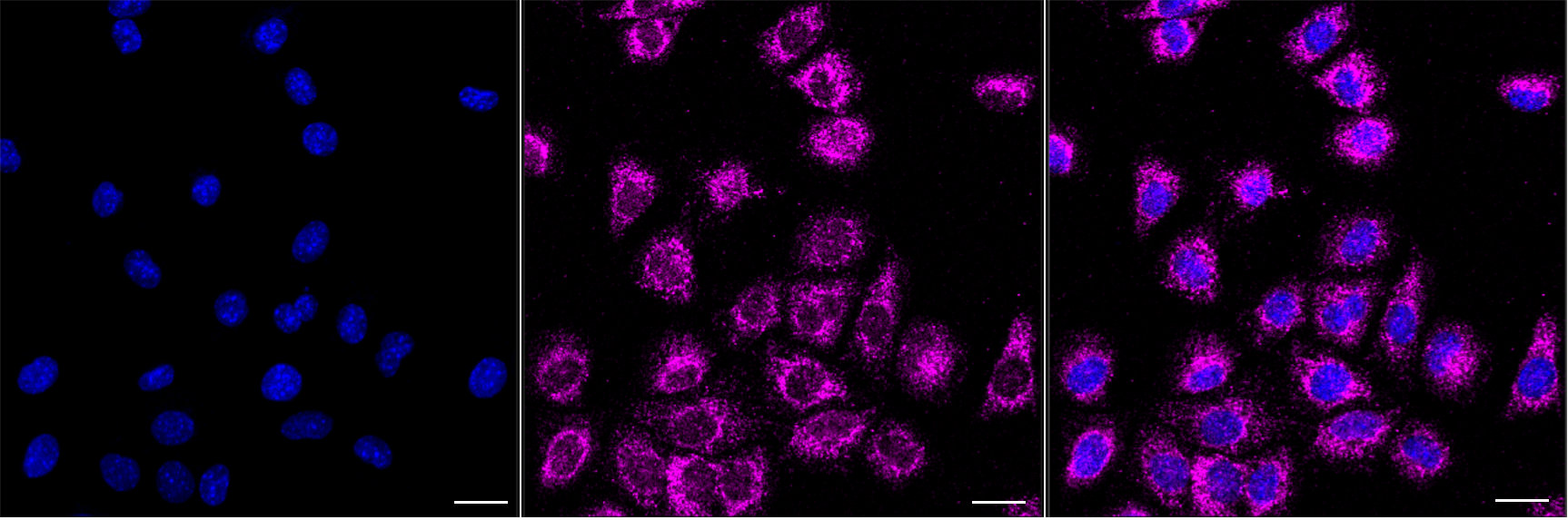 Immunocytochemical staining of C2C12 cells with NDUFAF5 antibody. Nuclei were stained blue with DAPI; NDUFAF5 was stained magenta with Alexa Fluor? 647. Images were taken using Leica stellaris 5. Protein abundance based on laser Intensity and smart gain: Medium. Scale bar, 20 μm.