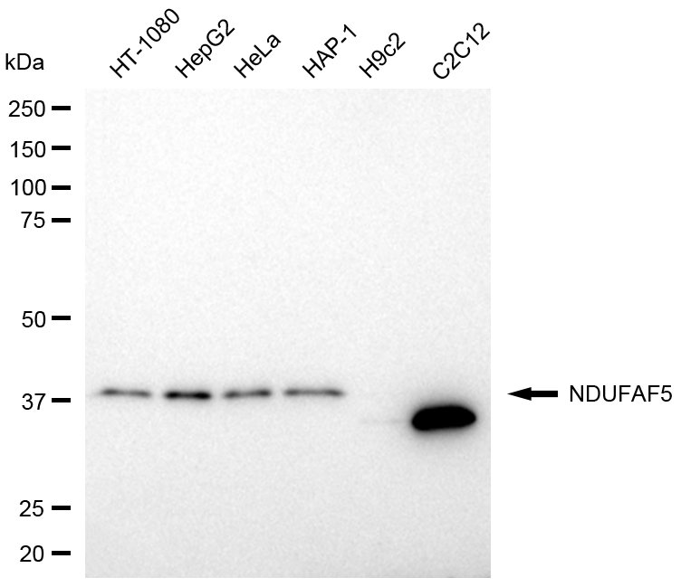 Western blotting analysis using NDUFAF5 antibody. Total cell lysates (30 μg) from various cell lines were loaded and separated by SDS-PAGE. The blot was incubated with NDUFAF5 antibody and HRP-conjugated goat anti-rabbit secondary antibody respectively.