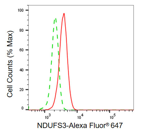 Flow cytometric analysis of NDUFS3 expression in HepG2 cells using NDUFS3 antibody. Green, isotype control; red, NDUFS3.