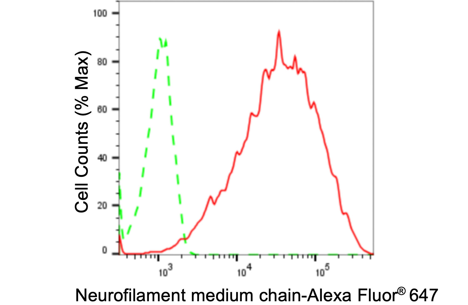 Flow cytometric analysis of Neurofilament medium chain expression in Hela cells using Neurofilament medium chain antibody. Green, isotype control; red, Neurofilament medium chain.