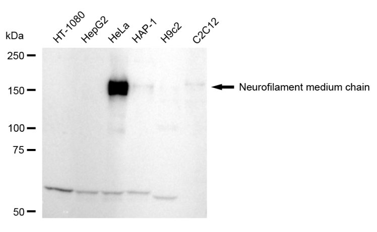 Western blotting analysis using Neurofilament medium chain antibody. Total cell lysates (30 μg) from various cell lines were loaded and separated by SDS-PAGE. The blot was incubated with Neurofilament medium chain antibody and HRP-conjugated goat anti-rabbit secondary antibody respectively.