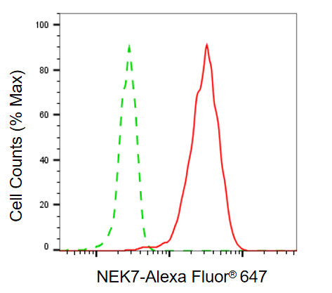 • Flow cytometric analysis of NEK7 expression in HepG2 cells using NEK7 antibody. Green, isotype control; red, NEK7.