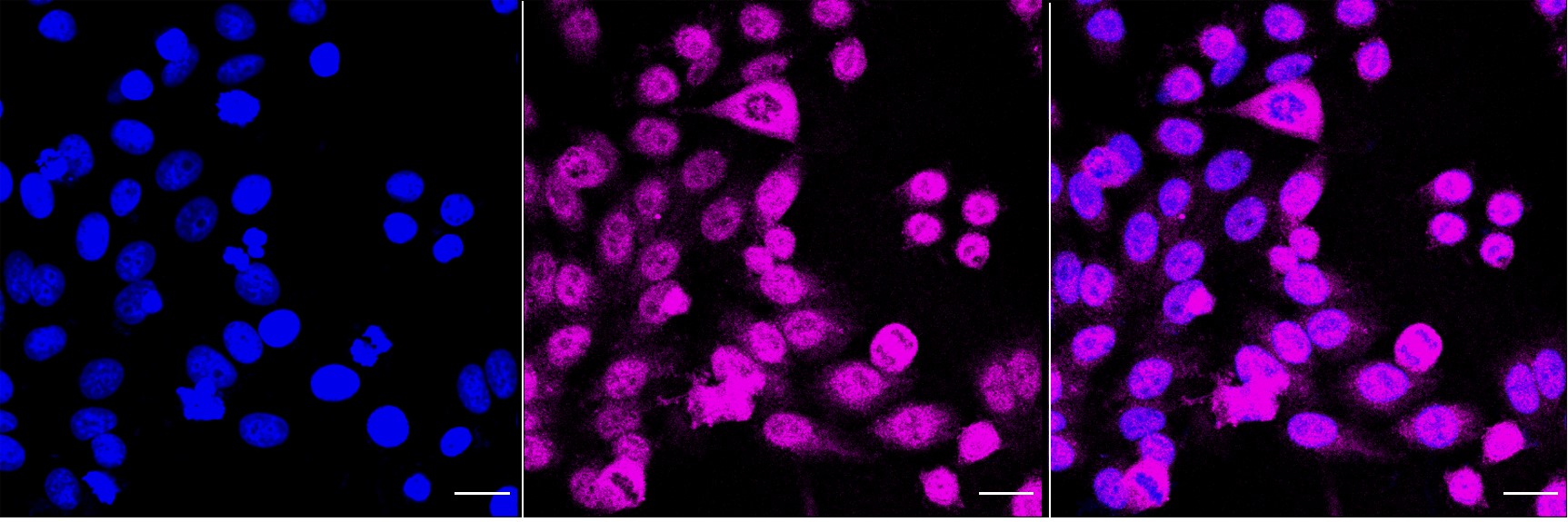 • Immunocytochemical staining of HepG2 cells with NEK7 antibody. Nuclei were stained blue with DAPI; NEK7 was stained magenta with Alexa Fluor? 647. Images were taken using Leica stellaris 5. Protein abundance based on laser Intensity and smart gain: Medium. Scale bar, 20 μm.